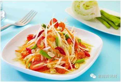 打玛轰这是老挝独具民族特色的莱肴,又叫舂木瓜。做先把木瓜剁成丝,然后把新鲜辣椒、西红柿、柠檬、盐、糖、味精、鱼露等放进石臼里,用石杵舂成糊状,再与木瓜丝拌合,酸、甜、辣、咸和带有鱼露特殊味道的舂木瓜便做成了。