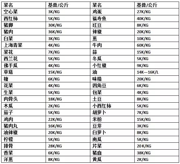 蔬菜肉类价格表