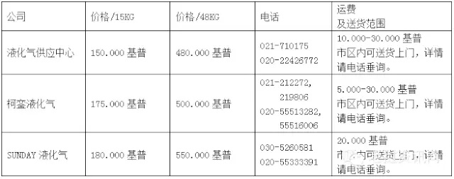 万象市液化气价格表