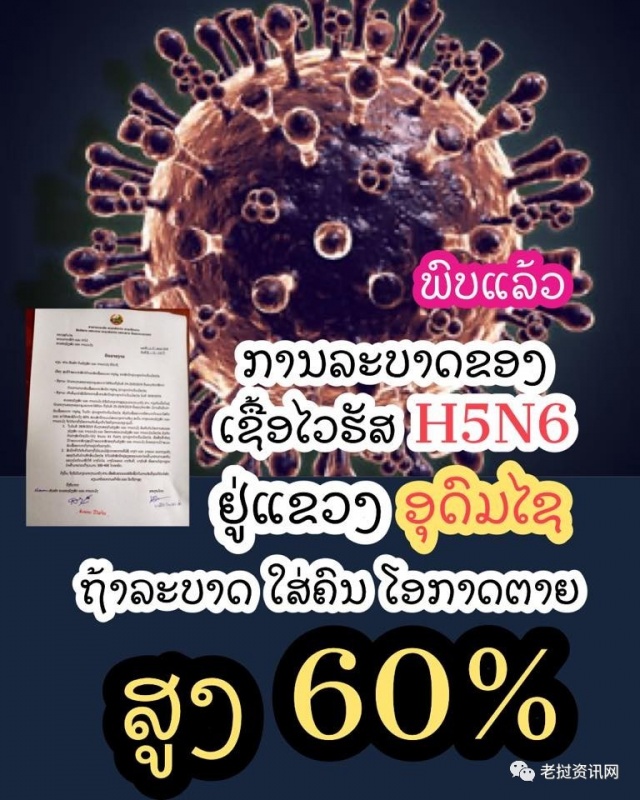 据老挝媒体Lao Youth Radio Station FM 90.0 Mhz报道,老挝乌多姆塞省在鸭子样本中发现H5N6禽流感感染,经研究,如人类感染,死亡率高达60%!