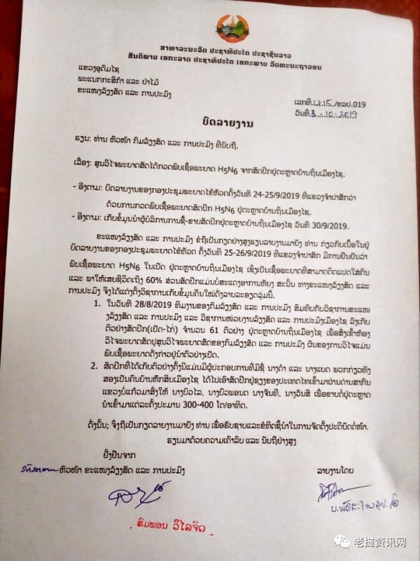 根据乌多姆塞省农林厅于2019年10月3日第415/BVO号有关动物疾病研究中心从孟赛县班厅村市场禽类动物中发现H5N6禽流感的报告说:通过占巴色省2019年9月25日至26日召开的禽流感会议报告证明,在孟赛县班厅村市场的鸭子中发现H5N6禽流感,这是一种可感染人体并且导致死亡率高达60%的疾病。