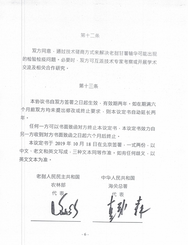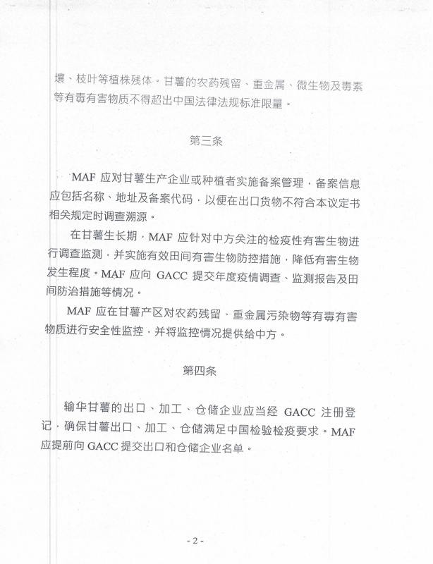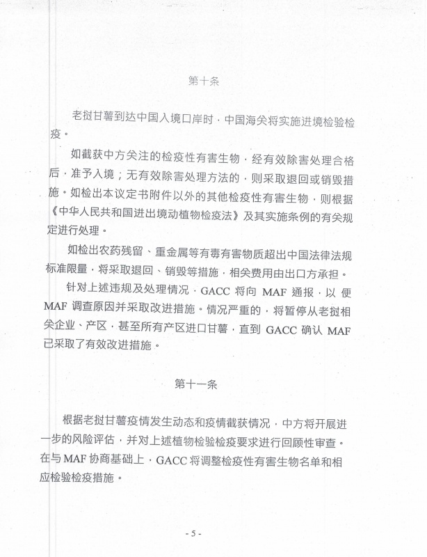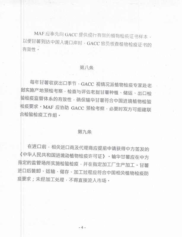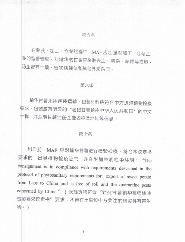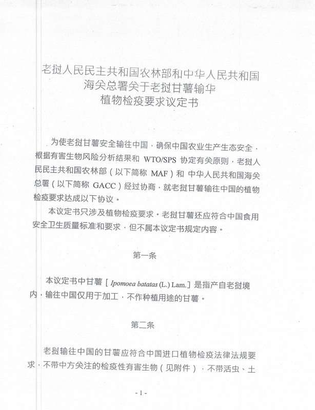 为使老挝甘薯安全输往中国,确保中国农业生产生态安全,根据有害生物风险分析结果和WTO/SPS协定有关原则,近日老挝人民民主共和国农林部(以下简称MAF)和中华人民共和国海关总署(以下简称GACC)经过协商,就老挝甘薯输往中国的植物检疫要求达成以下协议。