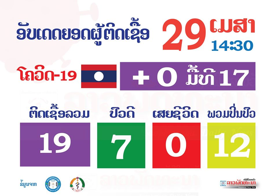 老挝资讯网讯 老挝卫生部当地时间4月29日14:30发布最新疫情动态,从4月28日14:30至4月29日14:30,老挝无新增例新冠肺炎确诊病例,新增治愈1例,来自琅勃拉邦。截至目前,老挝累计确诊19例,累计治愈8例(其中万象5例、琅勃拉邦3例)。从4月13日以来,老挝连续第17天“0”新增。
