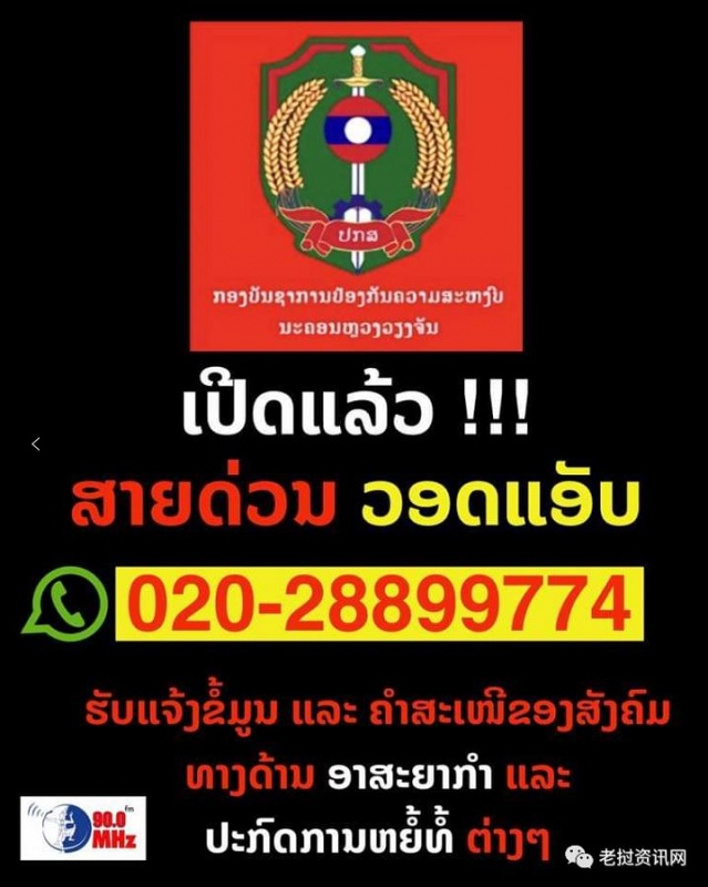 老挝万象市国防司令部在WhatsApp上开通了020-28899774的“警察服务热线”,用来接收社会上有关犯罪和各消极现象的信息,以及在安全工作领域需要寻求帮助的各问题和建议。对于那些想要披露信息的人必须通过信息、图像、视频、音频或其他证据来披露。所有提交的消息和证据将被保密,发件人(披露者)的信息将不会被公开。有需要的市民可保存号码:020-28899774