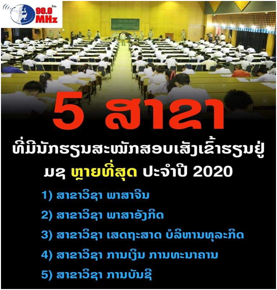 2020年至2021学年,老挝国立大学入学考试共有14,300多人报名参加,107个专业将接收9000多名学生。其中5门成为学生报考最热门专业,分别为:中文、英文、经济与企业管理学、金融与银行学、会计学。