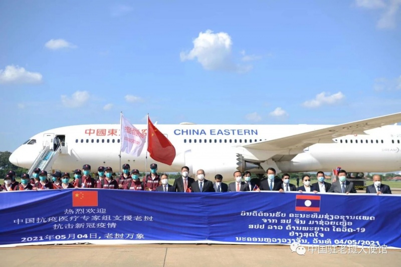 5月4日下午,中国政府援老抗疫医疗专家组抵达万象国际机场,姜再冬大使和老挝政府副总理吉乔前往迎接,姜再冬并在机场接受媒体采访。