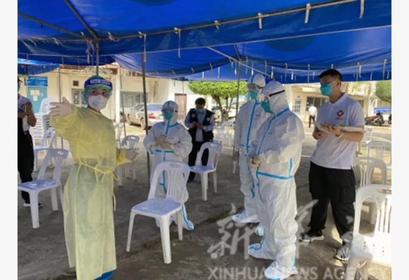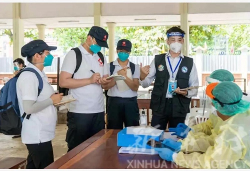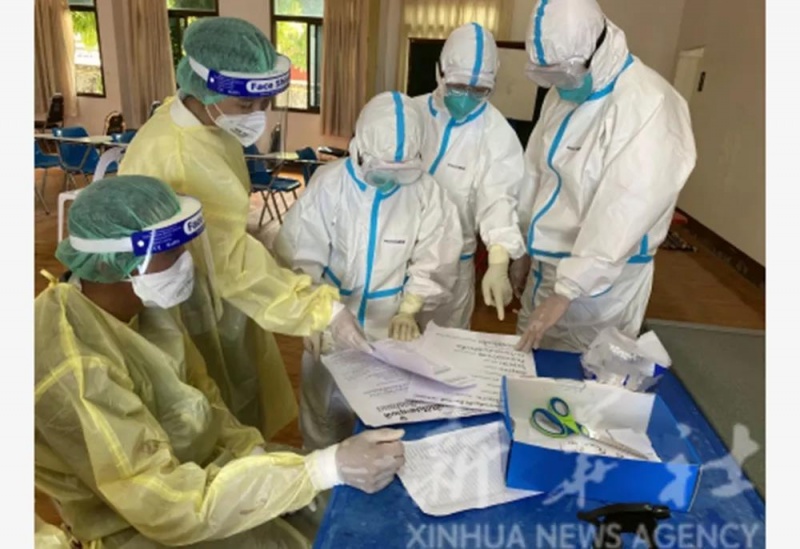 5月7日,中国政府医疗专家组在老挝首都万象考察一个新冠病毒采样点。新华社发(中国政府医疗专家组供图)