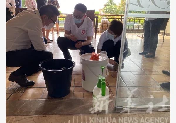 中国政府援老抗疫医疗专家组5月4日抵达老挝后到首都万象多个新冠隔离酒店进行考察,对隔离酒店管理流程和酒店消毒规范进行指导。新华社发(中国政府医疗专家组供图)